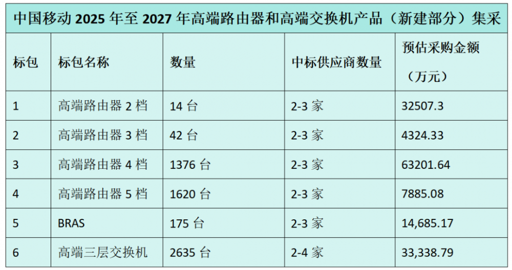 根据此前发布的招标公告,该项目集中采购产品为高端路由器、BRAS、高端三层交换机,预估采购规模高端路由器3052台、BRAS设备175台、高端交换机2635台。预计本次采购需求满足期为两年。项目划分为六个标包,标包1、3、5中标候选人尚未公示。